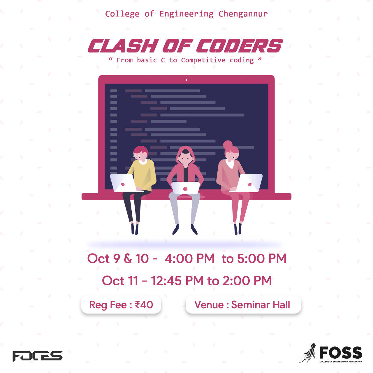 Here are the insights from the first day of sessions from "Clash of Coders" conducted by FOCES CEC. The session was on "Basics of C" and was taken by Malavika V Pillai. The attendees, who are from a background different from that of Computer Science found the best necessity of the program with an exposure to coding environment.